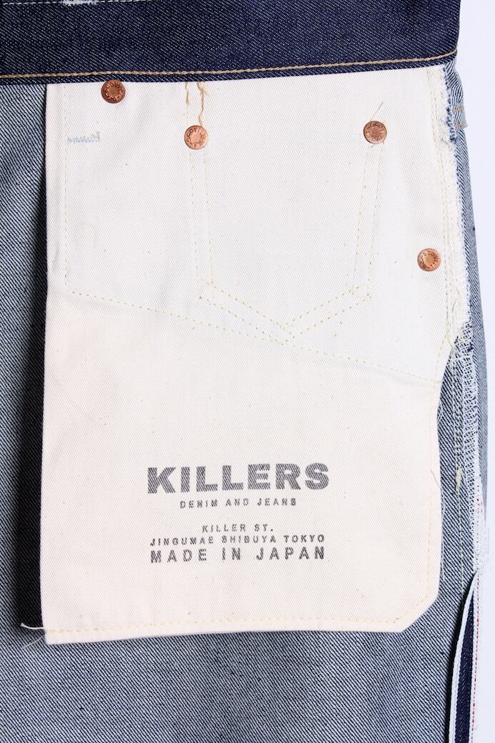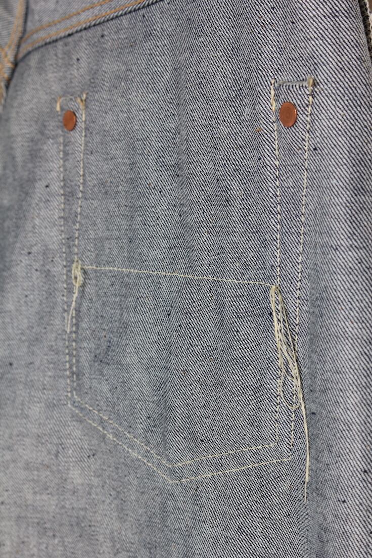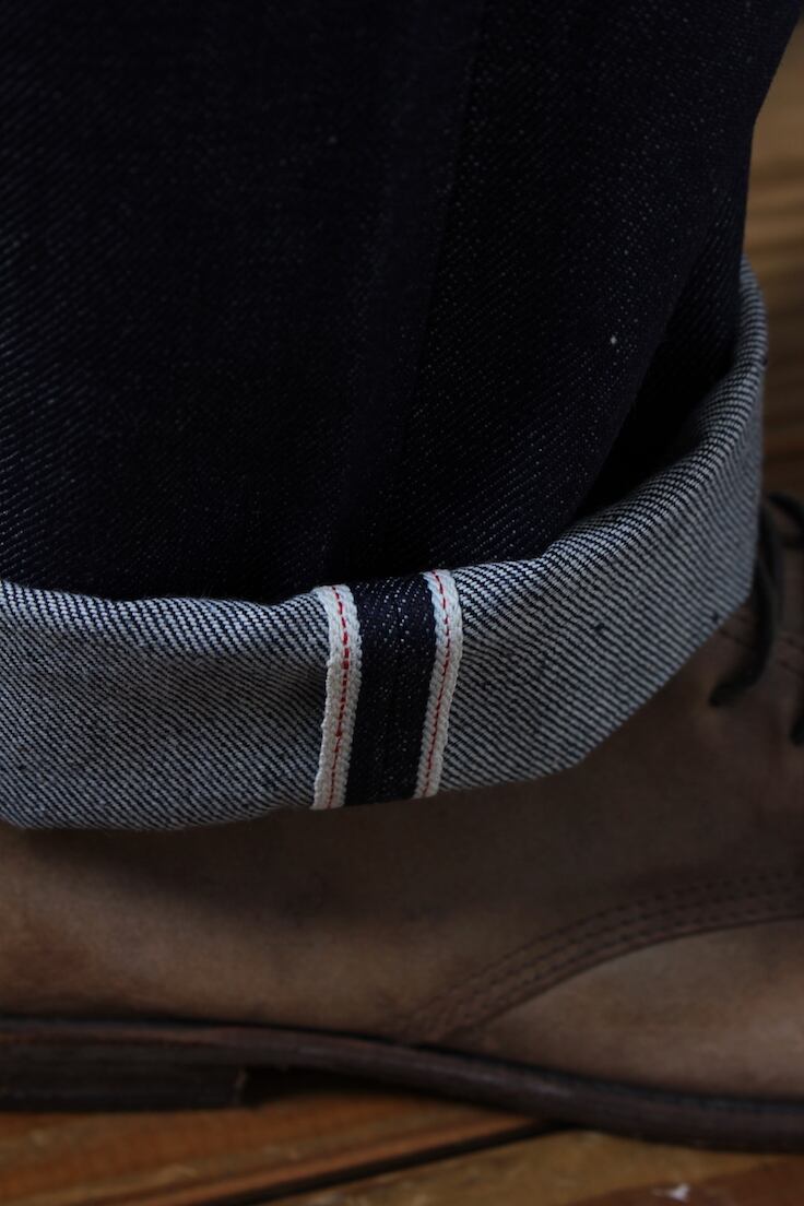 ディテールは、サイドポケットが2つと右前にウォッチポケットが1つ、後には補強したバックポケットが2つの計5つのポケット、素材はセルヴィッジ仕様の13¾オンスのリジッドデニム、附属のリベットとステープルボタンだけは米国スコービル社製を採用してます。