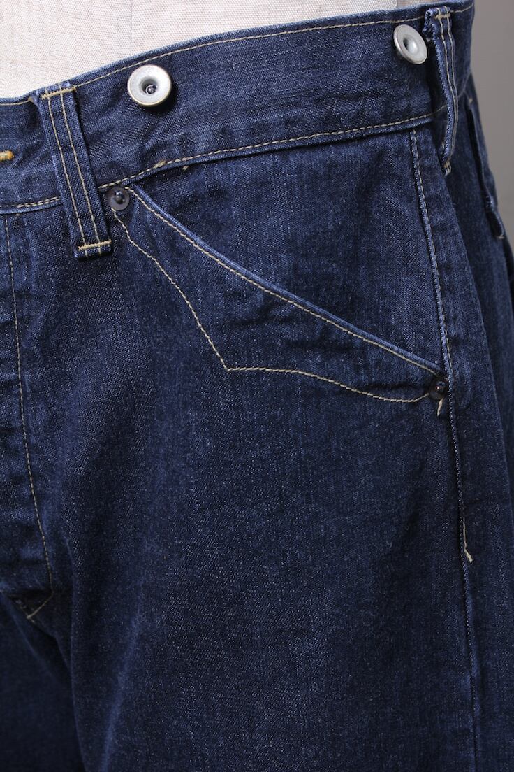 特に目を引くのは後ろ身頃のV字に切ったフィッシュテール、その両サイドのサスペンダーボタンとシンチバックのコンビネーションです。また、機能美とも言えるフロントポケットのステッチワークや、後身のシェブロンポケットのステッチワーク等々、凝ったディテールアレンジがさり気なく施されています。