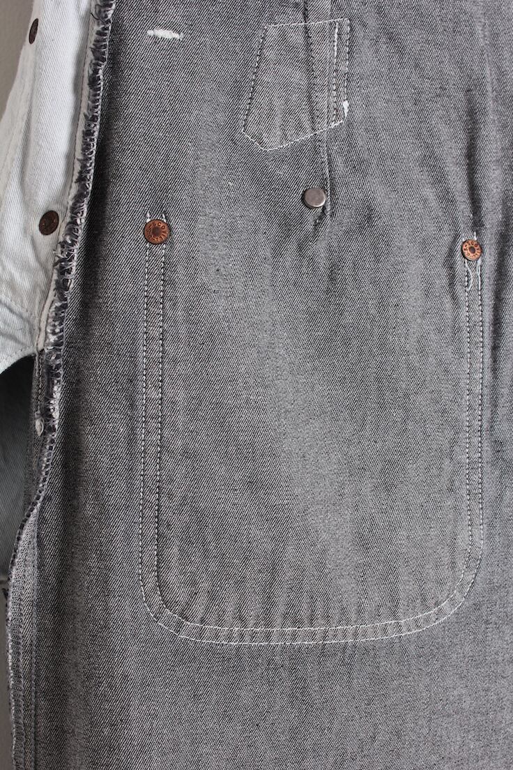 特に目を引くのは後ろ身頃のV字に切ったフィッシュテール、その両サイドのサスペンダーボタンとシンチバックのコンビネーションです。また、機能美とも言えるフロントポケットのステッチワークや、後身のシェブロンポケットのステッチワーク等々、凝ったディテールアレンジがさり気なく施されています。