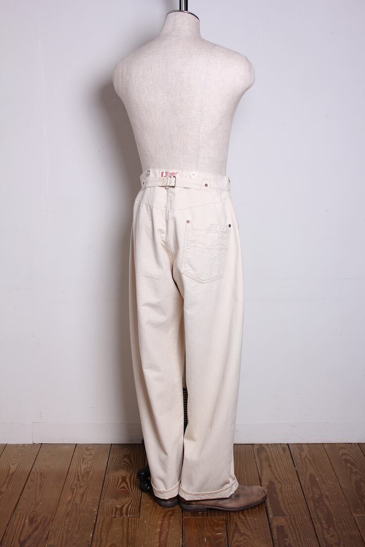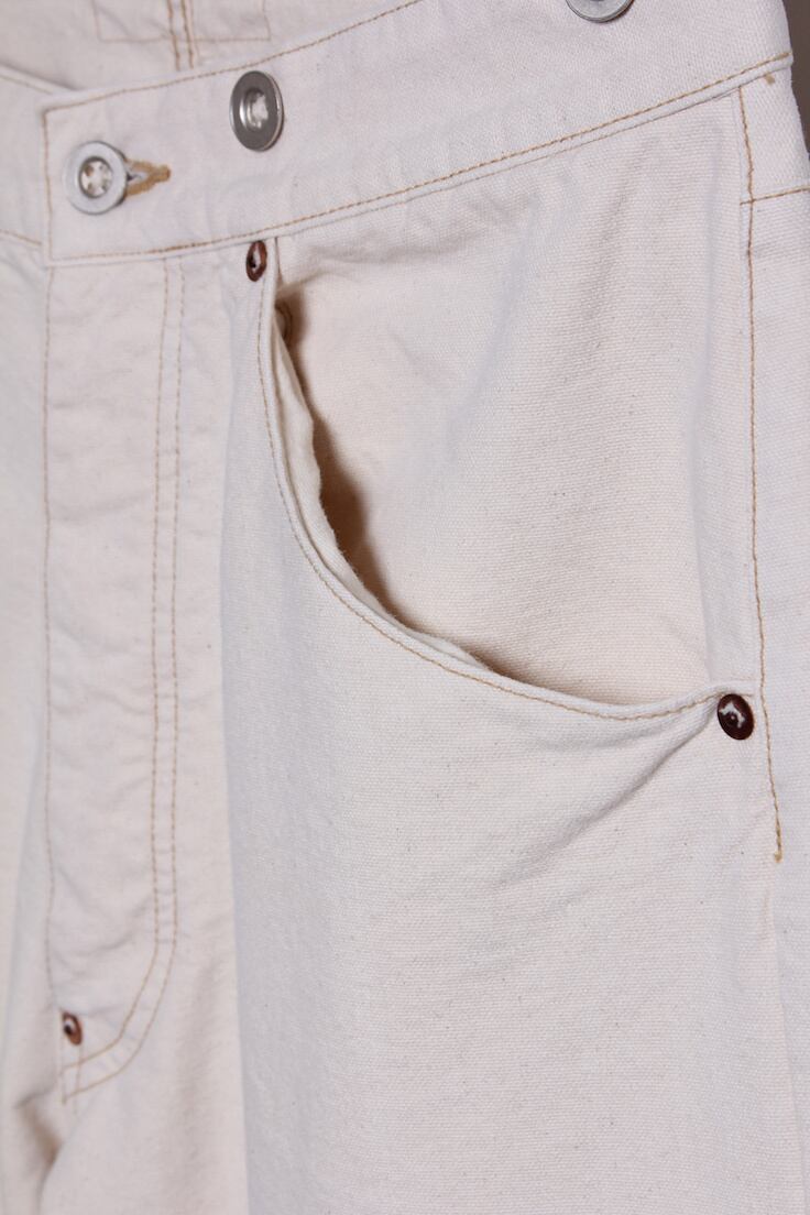 特に目を引くのはゆったり目に設定したシルエット、ウォッシュ加工を施したライトなコットンダックと相まって今時の旬なスタイルを演出してくれそうです。程好くアタリを出した熟れた風合いは、軽くて柔らかくてまるで以前から愛用していたかのような履き心地です。糸付けしたサスペンダーボタンや大きなシンチバックは名品へのオマージュ。バックポケットは右側のみの4ポケット仕様。